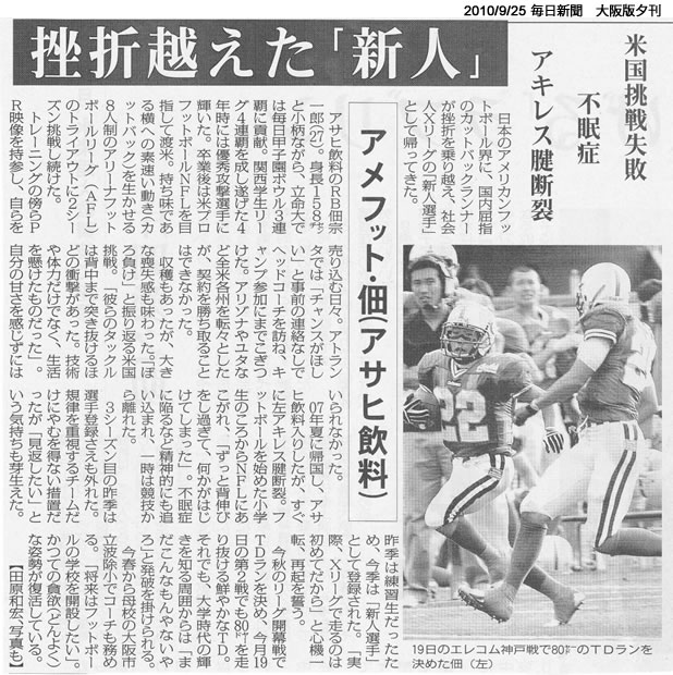 ・2010/09/25 毎日新聞大阪版夕刊 「挫折を越えた新人」 <コピ-を表示>